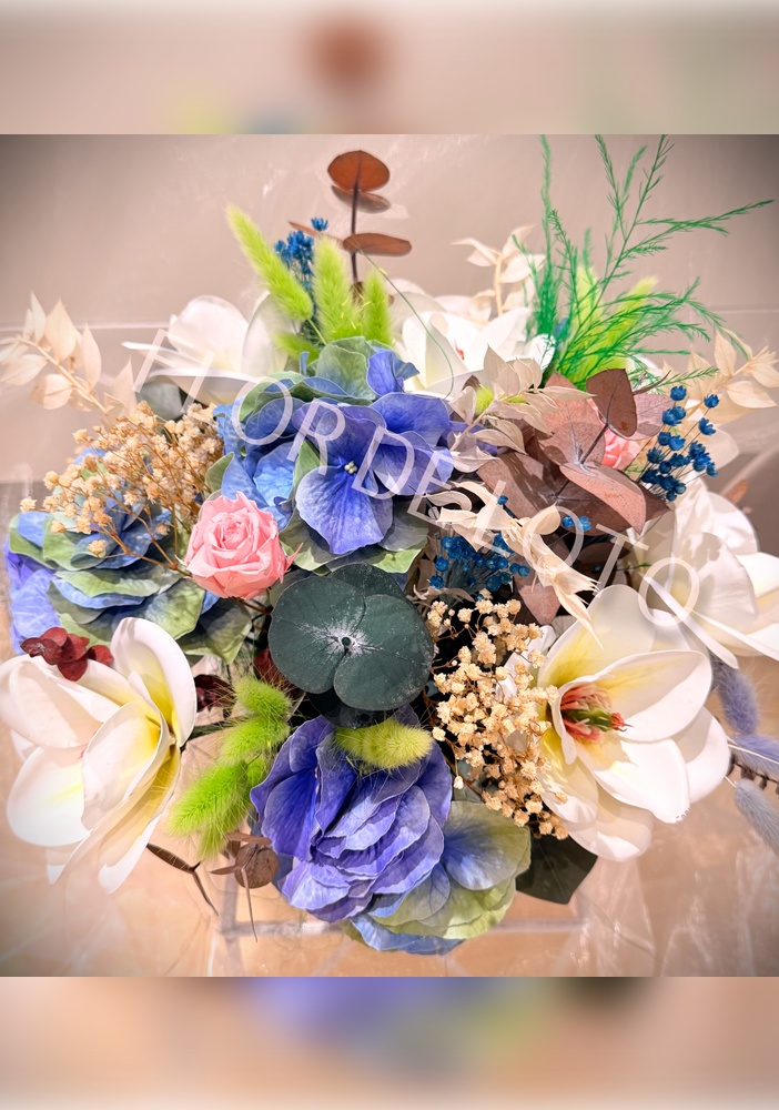 Centro Lila compuesto con flor preservada y flor artificial en base redonda. Diámetro 44cm.